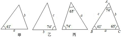 如圖,已知△ABC的六個(gè)元素,下面甲、乙、丙三個(gè)三角形中標(biāo)出了某些元素,則與△ABC全等的三角形是( )![]()