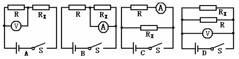 | 如圖所示的四個電路,已知R的阻值和電源電壓值,能根據(jù)已知條件和電表示數(shù)求出電阻Rx值的是: |