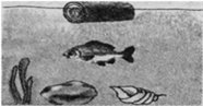 | 木頭、小魚(yú)、石塊、海螺在水中靜止時(shí)的位置如圖所示,分析它們所受的浮力,錯(cuò)誤的是 |