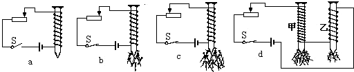 為了檢驗(yàn)上述猜想是否正確,小麗所在實(shí)驗(yàn)小組通過交流與合作設(shè)計(jì)了以下實(shí)驗(yàn)方案用漆包線(表面涂有絕緣漆的導(dǎo)線)在大鐵釘上繞制若干圈,制成簡單的電磁鐵.圖所示的a、b、c、d為實(shí)驗(yàn)中觀察到的四種情況。