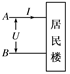 在一次研究性學習活動中,研究小組對一幢居民樓的供電設施進行了觀察和測量,整幢居民樓的供電線路可簡化為如圖所示的模型,暫停供電時,用歐姆表測得A、B間電阻為R,恢復供電后,測得A、B間電壓為U,進線電流為I,則計算該幢居民樓的總功率可以用的公式是 ( )