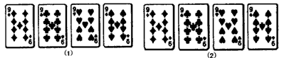 | 4張撲克牌如圖(1)所示放在桌子上,小敏把其中一張旋轉(zhuǎn)180o后得到如圖(2)所示,那么她所旋轉(zhuǎn)的牌從左數(shù)起是 |