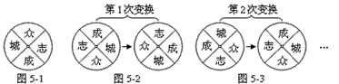 | 有一個(gè)四等分轉(zhuǎn)盤,在它的上、右、下、左的位置分別掛著“眾”、“志”、“成”、“城”四個(gè)字牌,如圖5-1.若將位于上下位置的兩個(gè)字牌對(duì)調(diào),同時(shí)將位于左右位置的兩個(gè)字牌對(duì)調(diào),再將轉(zhuǎn)盤順時(shí)針旋轉(zhuǎn)90。,則完成一次變換.圖5-2,圖5-3分別表示第1次變換和第2次變換.按上述規(guī)則完成第9次變換后,“眾”字位于轉(zhuǎn)盤的位置是 |