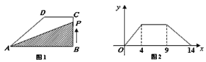 | 如圖1,在直角梯形ABCD中,∠B=90°,DC∥AB,動點P從B點出發(fā),沿折線B→C→D→A運動,設(shè)點P運動的路程為x,△ABP的面積為y,如果關(guān)于x的函數(shù)y的圖像如圖2所示,則△ABC的面積為 |