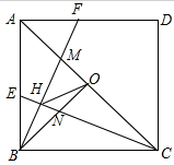 | 下列命題:如圖,正方形ABCD中,E、F分別為AB、AD上的點,AF=BE,CE、BF交于H,BF交AC于M,O為AC的中點,OB交CE于N,連OH。下列結(jié)論中:①BF⊥CE;②OM=ON;③OH= ④ |