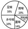 | 某學(xué)校七年級(jí)三班有50名學(xué)生,現(xiàn)對(duì)學(xué)生最喜歡的球類運(yùn)動(dòng)進(jìn)行了調(diào)查,根據(jù)調(diào)查的結(jié)果制作了扇形統(tǒng)計(jì)圖,如圖所示。根據(jù)扇形統(tǒng)計(jì)圖中提供的信息,給出以下結(jié)論: ①最喜歡足球的人數(shù)最多,達(dá)到了15人; ②最喜歡羽毛球的人數(shù)最少,只有5人; ③最喜歡排球的人數(shù)比最喜歡乒乓球的人數(shù)少3人; ④最喜歡乒乓球的人數(shù)比最喜歡籃球的人數(shù)多6人。 其中正確的結(jié)論有 |