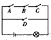 | 如圖,電路圖上有四個(gè)開關(guān)A、B、C、D和一個(gè)小燈泡,閉合開關(guān)D或同時(shí)閉合開關(guān)A、B、C都可使小燈泡發(fā)光,任意閉合其中一個(gè)開關(guān),則小燈泡發(fā)光的概率等于( )。 |