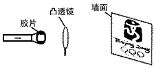 | 小明自制了一個簡易投影儀(如圖),在暗室中將印有奧運五環(huán)(紅、黃、藍(lán)、綠、黑五色環(huán))標(biāo)志的透明膠片,貼在發(fā)白光的手電筒上,并正對著焦距為10cm的凸透鏡。調(diào)整手電筒、凸透鏡、白色墻壁之間的位置,在墻上得到了一個清晰正立放大的像,下列說法錯誤的是: |