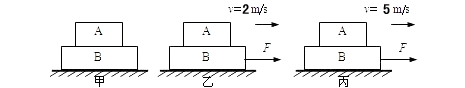 | A.B兩物體疊放在水平桌面上,在如下圖所示的三種情況下: ①甲圖中兩物體均處于靜止狀態(tài); ②乙圖中水平拉力F作用在B物體上,使A.B一起以2m/s的速度做勻速直線運動; ③丙圖中水平拉力F作用在B物體上,使A.B一起以5m/s的速度做勻速直線運動。 比較上述三種情況下物體A在水平方向的受力情況,以下說法正確的是: |