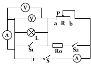 | 在圖所示的電路中,閉合開關(guān)s,讓開關(guān)S1和S2 斷開,調(diào)節(jié)滑動變阻器的滑片P使其位于變阻器的最左端口處,此時燈泡L恰好正常發(fā)光,電流表A和電壓表V均有示數(shù)。已知變阻器的總電阻大于燈泡L的電阻,以下判斷正確的是: |