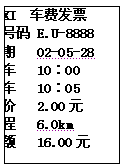| 某人乘坐出租車在平直公路上勻速行駛,下表為他乘車到達(dá)目的地時的車費發(fā)票。 (1)出租車行駛的時間為 A.5s B.5min C.5h D.5天 (2)出租車行駛的速度為 A.10m/s B.15m/s C.20m/s D.25m/s |