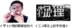| 如圖所示,甲是小艷利用某透鏡觀察到的小明眼睛的像;乙是小亮利用某眼鏡觀察到的課本上“物理”字的像。關(guān)于上述兩種情況中所觀察到的像或用到的光學(xué)儀器,下列說法正確的是 |