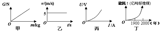 A.圖甲說明物體所受的重力跟它的質(zhì)量成正比 B.圖乙表示物體正以5m/s的速度作變速運動 C.圖丙告訴我們小燈泡的電阻值是固定不變的 D.圖丁警示我們一個多世紀(jì)以來人類能源消耗急劇增長 |