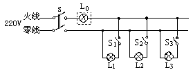 工人師傅常用一只標有“220V 40W”的燈泡L0(檢驗燈泡)取代保險絲來檢查新安裝的照明電路中每個支路的情況,如圖所示。當只閉合S、S1時L0不亮;當只閉合S、S2時L0和L2都呈暗紅色;當只閉合S、S3時L0正常發(fā)光。由此可以判斷