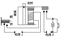 | 如圖是火警自動報(bào)警原理圖。發(fā)生火警時,將會發(fā)生下列變化,其變化順序是 ①溫度升高使銅鐵雙層金屬片向下彎曲,從而接通電磁鐵電路。 ②接通觸點(diǎn)使報(bào)警電路中有電流通過。 ③電磁鐵具有磁性。 ④銜鐵被吸下。 ⑤紅燈亮、電鈴響,發(fā)出警報(bào)。 |