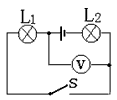 | 如圖所示,當(dāng)開關(guān)S閉合后,電壓表測出的電壓 |