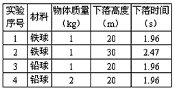 | 物體只在重力作用下由靜止開始下落的運動,叫做自由落體運動,這種運動只在沒有空氣的空間才能發(fā)生,在有空氣的空間,如果空氣阻力相對物體的重力比較小,可以忽略,物體的下落也可以近似地看作自由落體運動。為了探究自由落體運動時間與哪些因素有關(guān),同學(xué)小王有如下猜想: 猜想一:物體下落的時間與物體的材料有關(guān); 猜想二:物體下落的時間與物體下落的高度有關(guān); 猜想三:物體下落的時間與物體的質(zhì)量有關(guān)。 為驗證猜想的正確性,幾位同學(xué)用三個金屬球做了一系列實驗,實驗數(shù)據(jù)記錄如下: 為了驗證猜想一,應(yīng)比較實驗序號_______,結(jié)論是:物體下落的快慢與材料無關(guān);小敏同學(xué)也對這個問題進(jìn)行了研究,她讓質(zhì)量相等的鐵球和紙團(tuán)同時從三樓由靜止開始下落,她發(fā)現(xiàn)兩者下落時間________,原因是紙所受的阻力相對于紙的重力不能忽略不計(合理即可)。 |