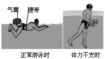 | 有一種被稱作“跟屁蟲”的輔助裝備是游泳安全的保護神!案ㄏx”由一個氣囊和腰帶組成,兩者之間由一根線連接(如圖所示)。正常游泳時,連接線是松馳的,氣囊漂浮著,跟人如影相隨。在體力不支等情況下,可將氣囊壓入水中,防止人下沉,在此情況下 |