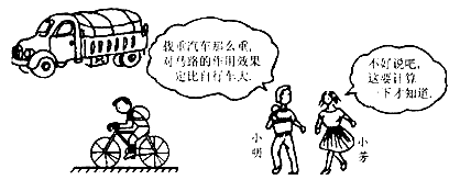 | 已知汽車車輪與水平地面的總接觸面積為1500cm2,貨物與車的總質(zhì)量為6t。自行車車輪與水平地面的總接觸面積為20cm2,騎車人質(zhì)量為75kg,自行車質(zhì)量為10kg。小明的說法是否正確? |