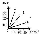 | A、B、C三種物質的質量m與體積V的關系圖線如圖所示,A、B、C、三種物質的密度ρA、ρB、ρC和水的密度ρ水之間的關系 |