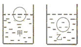 | 兩個相同的容器中,分別盛有甲、乙兩種液體,把完全相同的兩個小球分別放入兩個容器中,當(dāng)兩球靜止時液面相平,球所處位置如圖所示。甲、乙兩種液體對容器底部的壓強大小分別為P甲、P乙,兩球在甲、乙兩種液體中所受浮力大小分別為F甲、F乙,則它們的大小關(guān)系是 |