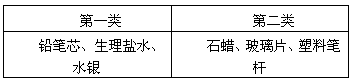 | 現(xiàn)有石蠟、鉛筆芯、塑料筆桿、玻璃片、生理鹽水、水銀,小明將它們分成如下表所示的兩類,其分類的依據(jù)是 |