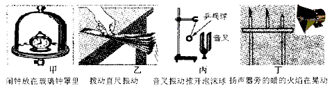 A.甲實驗說明聲音的傳播需要介質 B.乙實驗說明鋼尺振動的頻率越高,響度越大 C.丙實驗說明音叉的振幅越大,音調越高 D.丁實驗說明聲波不能傳遞能量 |