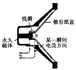 | 當(dāng)揚(yáng)聲器中的線圈通過的電流方向如圖所示時(shí),線圈向左運(yùn)動(dòng);那么當(dāng)電流方向改變時(shí),線圈將向________運(yùn)動(dòng);如此反復(fù),線圈帶動(dòng)紙盆振動(dòng)而發(fā)聲,與揚(yáng)聲器原理相似的是_________。 |