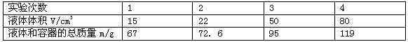 | 小明同學(xué)在測定液體密度的實驗中,沒有把容器的質(zhì)量測出來,而是多次測出容器和液體的總質(zhì)量,并記錄在下表中。根據(jù)表中的數(shù)據(jù)求得液體的密度是___________g/cm3,容器的質(zhì)量是________g。 |