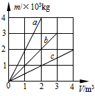 | 分別由不同物質(zhì)a、b、c組成的三個實心體,它們的質(zhì)量和體積的關(guān)系如圖所示,由圖可知 |