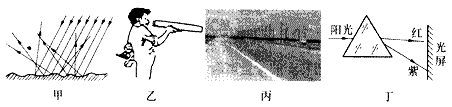 A.圖甲中漫反射的光線盡管雜亂無(wú)章,但每條光線仍然遵循光的反射定律 B.圖乙中小工師傅觀察木板是否平整,是利用了光的直線傳播特點(diǎn) C.圖丙所示炎熱夏天公路上的海市蜃樓景象,是由光的反射現(xiàn)象造成的 D.圖丁所示是太陽(yáng)光經(jīng)過(guò)棱鏡色散后的色光排列情況 |