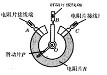 | 電位器和滑動(dòng)變阻器部是變阻器,它們的原理部足通過(guò)改變導(dǎo)體的長(zhǎng)度從而改變接入電路中的電阻。圖是某電位器的結(jié)構(gòu)示意圖,電阻片R的兩端分別與接線(xiàn)端A、C相連,滑動(dòng)片P的一端通過(guò)轉(zhuǎn)軸O與接線(xiàn)端B相連,另一端與電阻片R 接觸良好,并能繞轉(zhuǎn)軸O在電阻片R上滑動(dòng)。已知電阻片R 的總阻值為10Ω,將電位器A、B兩個(gè)接線(xiàn)端分別接在電壓為2.4 V的電源兩端。當(dāng)滑動(dòng)片P位于如圖所示的位置時(shí),接線(xiàn)端B、C間的電阻為6Ω。則下列說(shuō)法中正確的是 |