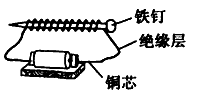 | 如圖,把一根包有絕緣層的導(dǎo)線繞在鐵釘上,把導(dǎo)線兩端的絕緣層刮去,接上干電池后,鐵釘 |