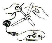 | 小明將微風(fēng)電風(fēng)扇與小燈泡按如圖所示的電路連接并進(jìn)行實(shí)驗(yàn),用手快速撥動風(fēng)扇葉片,這時發(fā)現(xiàn)小燈泡發(fā)光,微風(fēng)電風(fēng)扇居然變成了“發(fā)電機(jī)”。關(guān)于該實(shí)驗(yàn),下列說法正確的是 |
