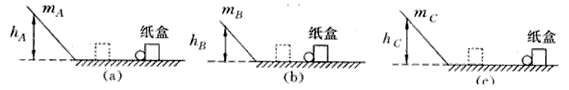 | 如下圖所示,在“研究物體動(dòng)能與哪些因素有關(guān)”的實(shí)驗(yàn)中,將A、B、C三個(gè)小球先后從同一裝置的hA, hB,hC 高處滾下(mA =mB<mC,hA=hC>hB),推動(dòng)紙盒運(yùn)動(dòng)一段距離后靜止。 (1)要研究動(dòng)能與質(zhì)量的關(guān)系,我們應(yīng)選擇________兩圖來(lái)進(jìn)行比較。 A. (a)和(c) B. (a)和(b) C. (b)和(c) (2)從圖中可以看出A、B、C三個(gè)小球剛到達(dá)水平面時(shí),_________球的動(dòng)能最大。 A.a(chǎn) B.b C.c |