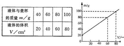 | 小明利用天平和量杯測量某種液體的密度,得到的數(shù)據(jù)如下表,根據(jù)數(shù)據(jù)繪出的圖象如圖所示.則量杯的質(zhì)量與液體的密度是 |