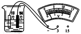 | 如圖所示,在燒杯中加入鹽水,然后將連在電壓表上的銅片和鋅片插入鹽水中,這樣就制成了一個電池.觀察電壓表指針的偏轉(zhuǎn)與接線可知:這個電池的電壓是________ V,________ 片是它的正極. |