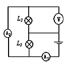 在圖中,V表示數(shù)為4.5V,A1、A2兩表示數(shù)分別為1.2A、0.9A,則電源由________節(jié)新干電池組成,通過L1、L2的電流分別為_________A和________ A。