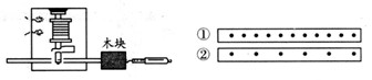 | 如圖所示,紙帶穿過(guò)打點(diǎn)計(jì)時(shí)器(每隔一定時(shí)間在紙帶上打下一個(gè)點(diǎn))與一木塊左端相連,木塊在彈簧測(cè)力計(jì)作用下沿水平桌面(紙面)向右運(yùn)動(dòng)時(shí),就能在紙帶上打出一系列的點(diǎn)。圖中①和②是打點(diǎn)計(jì)時(shí)器先后打出的兩條紙帶,與其對(duì)應(yīng)的測(cè)力計(jì)的示數(shù)分別為F1、F2,木塊運(yùn)動(dòng)的速度分別為v1、v2, 那么 |
