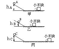如圖是探究“物體的動(dòng)能與何因素有關(guān)”的實(shí)驗(yàn),圖中三個(gè)小球先后從同一裝置的斜面上滾下,已知三個(gè)小球質(zhì)量關(guān)系為:mA=mB<mC,從高處下落的高度關(guān)系為:hA=hC>hB,被推動(dòng)的小木塊移動(dòng)的距離如圖中所示。