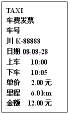 | 某人乘坐出租車在平直公路上勻速行駛,下表為他乘車到達(dá)目的地時(shí)的車費(fèi)發(fā)票。 (1)出租車行駛的時(shí)間為_(kāi)______。 A.5h B.5s C.5min D.5天 (2)出租車行駛的速度為_(kāi)______。 A.1.2m/s B.20m/s C.1.2km/h D.20km/h |