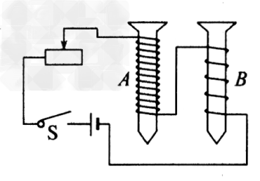 | 探究影響電磁鐵磁性強弱的因素時,按如圖所示電路進行實驗,每次實驗都觀察到電磁鐵A 吸引大頭針的數(shù)目比B 多。此實驗說明影響電磁鐵磁性強弱的因素是 |