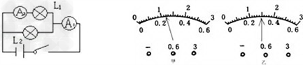 | 如圖所示兩電流表所用量程不明,當電路閉合后,電流表A1的示數(shù)如圖甲所示,電流表A2的示數(shù)如圖乙所示,則流過電燈L2的電流為________。 |