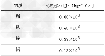 | 家用電器中大功率電子元件在工作時會產(chǎn)生較多熱量,為了盡快散熱,通常在大功率元件上加裝金屬散熱片,下表是四種材料的比熱容,選作散熱片最好的材料是 |