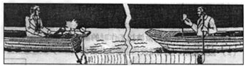 | 一次測(cè)定聲音在水中的傳播速度是1827年在日內(nèi)瓦湖上進(jìn)行的,兩只船相距14km,在一只船上實(shí)驗(yàn)員向水里放一口鐘,當(dāng)他敲鐘的時(shí)候,船上的火藥同時(shí)發(fā)光;另一只船上的實(shí)驗(yàn)員向水里放一個(gè)聽(tīng)音器,如圖所示,他看到火藥發(fā)光后10s聽(tīng)到了水下的鐘聲,水中的聲速是________。 |