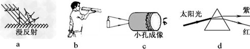 A.圖a中,漫反射的光線雜亂無(wú)章,因此不遵循光的反射定律 B.圖b中,木工師傅觀察木板是否光滑平整利用了光直線傳播的性質(zhì) C.圖c表示的是小孔成像情況,屏幕上出現(xiàn)的是物體倒立的虛像 D.圖d表示太陽(yáng)光經(jīng)過(guò)三棱鏡色散后的色光排列情況 |