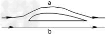 | 下圖表示氣流通過機翼上下表面時的情況,比較機翼上下a、b兩點的流速和壓強 |