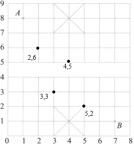 解答:解:馬要由點(diǎn)A(1,8)的位置跳到點(diǎn)B(7,1)的位置,走過的連線是:從A(1,8)開始,經(jīng)過點(diǎn)(2,6)、(4,5)、(3,3)、(5,2)、最后到達(dá)B(7,1),如下圖所示.