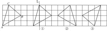 分析:根據(jù)圖形平移的特征,圖①是由三角形ABC向右平移5格得到的;根據(jù)軸對稱圖形的特征,圖②與三角形ABC成軸對稱圖形;根據(jù)旋轉(zhuǎn)圖形的特征,圖③是由三角形繞點(diǎn)B順時(shí)針(或逆時(shí)針)旋轉(zhuǎn)180°,再向右平移10格得到的.