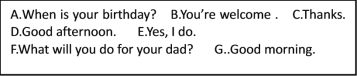【題目】閱讀對(duì)話,根據(jù)上下文從所給的七個(gè)句子中選擇五個(gè)句子,將對(duì)話補(bǔ)充完整并將其字母編號(hào)填在相應(yīng)的橫線上。